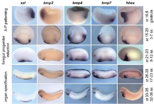 Figure S1. Developmental expression of szl, bmp2, bmp4, bmp7 and hhex. In situ hybridization to a stage series of Xenopus laevis embryos with the progressive steps in foregut organogenesis indicated on the left. Embryos stages 10.5-20 are bisected. Stage 10.5 gastrula embryos are oriented dorsal left and ventral right. All other stages are anterior left and ventral down. In the gastrula hhex and bmp2 are expressed in the dorsal mesendoderm, whereas szl, bmp4 and bmp7 are expressed on the opposite side of the embryo in the ventral mesoderm. After gastrulation this szl-, bmp4- and bmp7-expressing tissue has moved to the ventral-posterior side (stage 18-20), at which point szl, bmp2 and bmp7 are also expressed in the ventral foregut and precardiac mesoderm. ss, somite stage. |