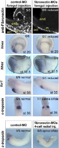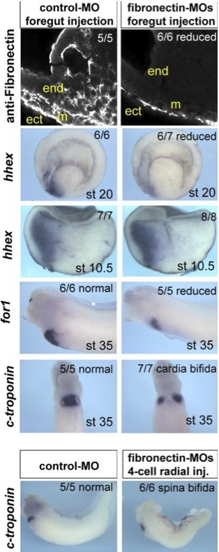Figure S6. Characterization of fn-MO injected embryos. Embryos were injected with either control-MO or fibronectin-MOs (a combination of fn1- MO and fn2-MO; 15 ng each), which target both fn genes in the C1/D1 cells of the 16- cell stage embryo, which targets the anterior mesendoderm. FN immunostaining (80 m Z-projection) of the foregut at stage 20 shows that the pericellular FN matrix as well as the FN fibril layer between the mesoderm (mes) and endoderm (end) (yellow arrows) is absent in fn-MO embryos (red arrows), whereas the FN layer between the mesoderm and ectoderm (ect) is still present. hhex expression in the foregut is reduced at stage (st) 20 in fn-MO, but in the gastrula (Stage 10.5) hhex expression is unaltered. At stage 35 fn-MO exhibit reduced the liver marker for1 and cardia bifida as shown by the heart marker c-troponin. Controls injecting the fibronectin-MOs into all cells of the 4-cell stage embryo resulted in frequent gastrulation defects. |