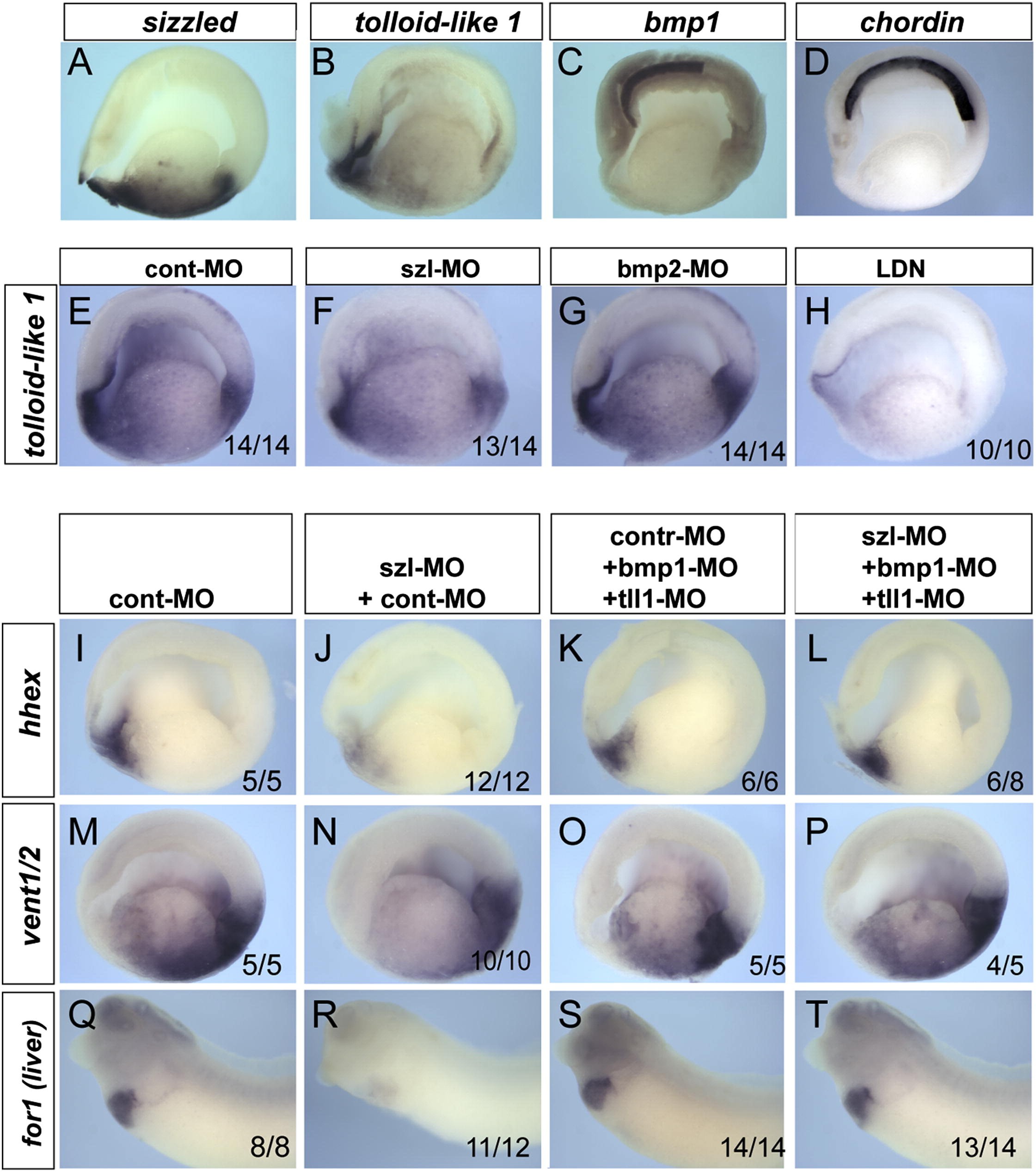 Figure 6. Knockdown of Tll Proteases Rescues the szl-MO Phenotype(A) Expression of szl, tll1, bmp1, and chordin in stage 18 embryos.(E) tll1 expression in embryos injected in the C1/D1 cells with control-MO (20 ng), szl-MO (15 ng), bmp2-MO (20 ng) or treated with BMP-receptor inhibitor LDN193189 (40 μM).(I) Knockdown of Tll1 and Bmp1 rescues the Szl morphant phenotype. tll1-MOs and bmp1-MOs (15 ng each) were injected into C1/D1 cells with or without szl-MO (15 ng) and assayed for hhex (I) and vent1/2 (M) at stage 20 and the liver marker for1 at stage 35 (Q).See also Figure S4. |