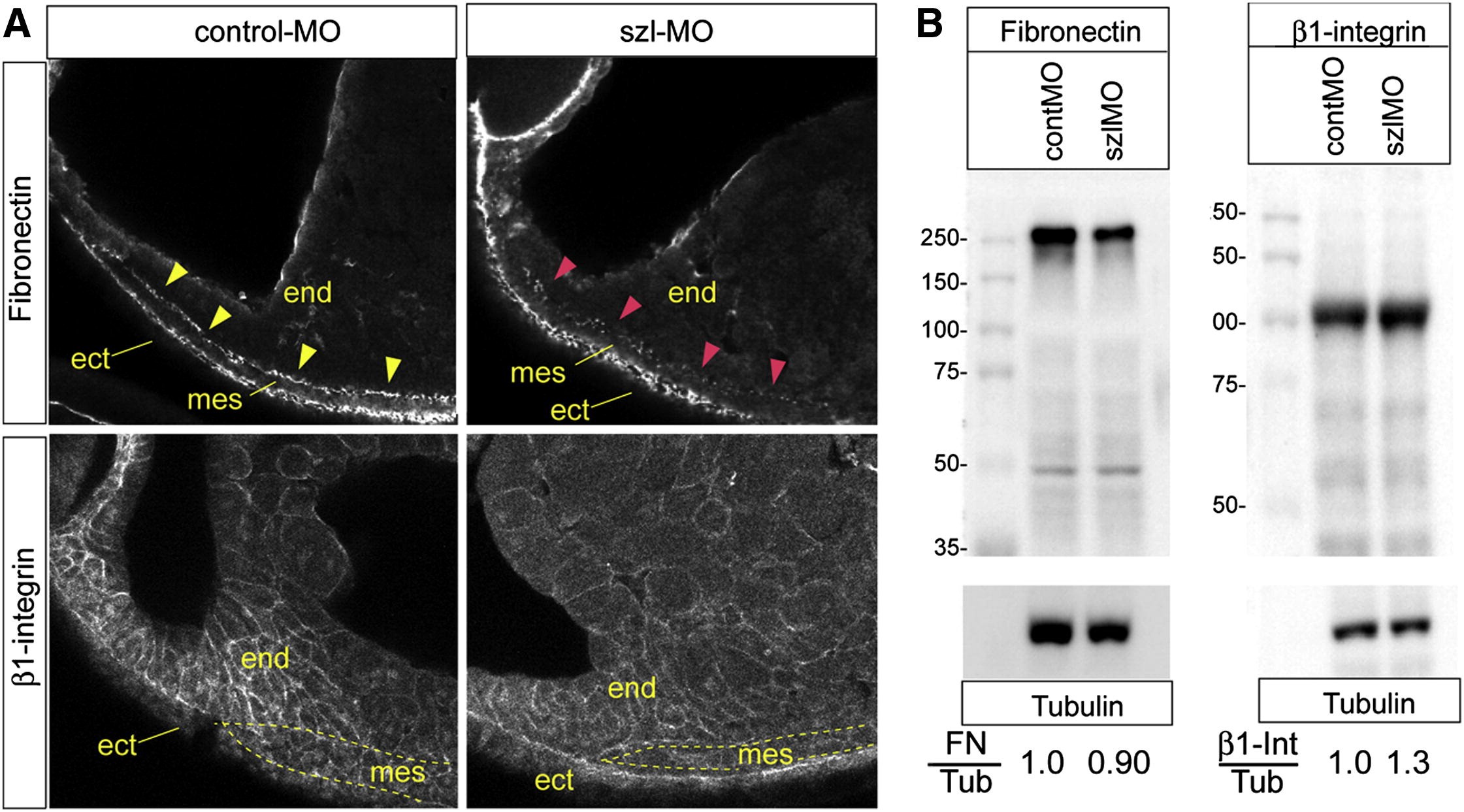 Figure 7. Loss of FN Matrix in szl-MO(A) FN and β1-integrin immunostaining (10 μm confocal slice) of cont-MO and szl-MO-injected foreguts at stage 180 shows that the FN matrix between the endoderm (end) and mesoderm (mes) (yellow arrows) is absent in szl-MO (red arrows). Yellow dashed lines outline the precardiac lateral plate mesoderm.(B) Western blots of foregut explants show no obvious degradation of FN or β1-integrin in Szl morphants. The relative FN/tubulin and integrin/tubulin levels in the szl-MO compared to the cont-MO, which was set to 1.0 is indicated.See also Figure S5. |