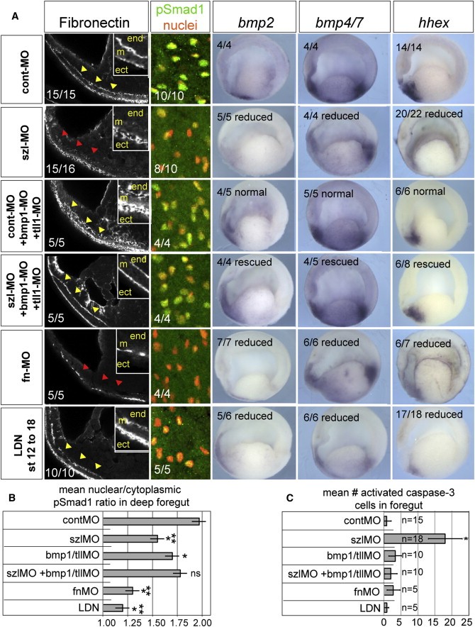 Figure 8. Szl-Tll Regulates FN Matrix Assembly, which Is Required to Maintain BMP Signaling(A) Embryos injected with cont-MO (20 ng), szl-MO (15 ng), cont-MO + bmp1-MO + tll1-MO (15 ng each), szl-MO + bmp1-MO + tll1-MO (15 ng each), or fn-MOs (15 ng) or treated with BMP-receptor inhibitor LDN193189 (40 μM). Confocal FN immunostaining (10 μm slice) shows FN fibrils (yellow arrow heads) between the foregut endoderm (end) and mesoderm (m), which are disrupted in szl-MO and fn-MO-injected embryos (red arrow heads). Confocal immunostaining of pSmad1 (green) and nuclei (red) in the foregut endoderm (50 μm Z-projection four to nine nuclei from the mesoderm) and in situ for bmp2, bmp4/7, and hhex indicate that BMP signaling was reduced in szl-MO, fn-MO, and LDN-treated embryos. Knockdown of Bmp1/Tll1 rescues the FN matrix, pSmad1 levels and BMP-responsive gene expression in Szl morphants. See also Figure S6.(B) Mean nuclear/cytoplasmic pSmad1 immunostaining intensity SEM in foregut cells located four to nine nuclei from the mesoderm, quantitated from 80 μm Z-projection from four sibling embryos/condition. Significantly different from contMO in t test: âp < 0.05, ââLS mean difference > 0.3; p < 0.01; ns, not significant.(C) Mean number of activated caspase-3 foregut cells SEM. âp < 0.05 compared to cont-MO.Error bars reflect SEM. |