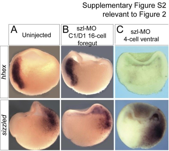 Figure S2. Targeted injection of the szl-MO into the foregut does not disrupt gastrula axial pattering. Embryos were either (A) uninjected or injection with the szl-MO (20 ng) into (B) C1/D1 cells at the 16-cell stage, which give rise to the foregut or (C) injected into ventral cells at the 4-cell stage. Injection of szl-MO into the C1/D1 presumptive foregut (B) did not alter gastrula stage axial pattering as indicated by no change in hhex or szl expression in the organizer or ventral mesoderm respectively, and no alterations in pSmad1/5/8 immunostaining. In contrast injection of the szl-MO into the ventral cells of the 4-cell- stage embryo resulted in axial pattering defects with elevated pSmad1/5/8, expanded expression of szl (a bmp-target) and a loss of hhex, all of which are consistent with previously published work showing that Szl in the gastrula mesoderm regulates axial pattering by repressing BMP signaling. Thus injection of the szl-MO into different regions of the embryos reveals distinct temporal and spatial Szl functions. |