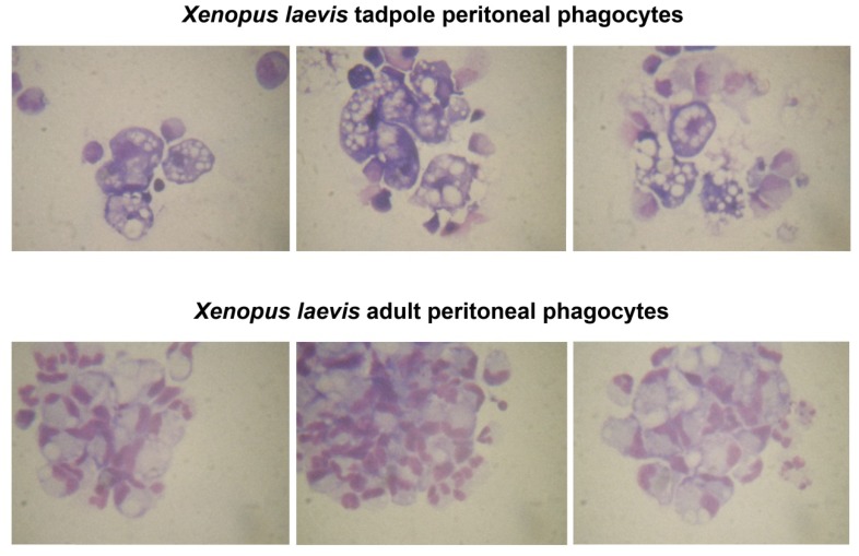 Figure 2. Comparison of Xenopus laevis tadpole and adult peritoneal macrophages. Peritoneal leukocytes were collected from frogs 3 days after elicitation with heat-killed Escherichia coli. Cells were seeded in and allowed to adhere to bottoms of 24 well plates for 3 hours. Non-adherent cells were removed, the adherent cells washed and cultured for further 4 days. Cells were cytospun onto glass slides and Giemsa stained according to standard protocol. Upper panels represent peritoneal macrophages collected from tadpoles and lower panels represent peritoneal macrophages derived from adult frogs.