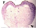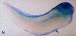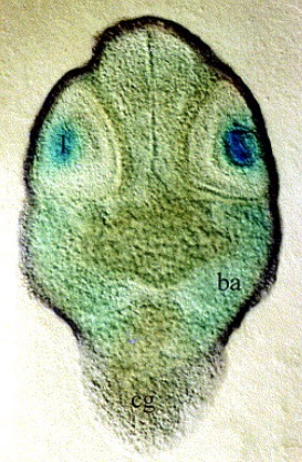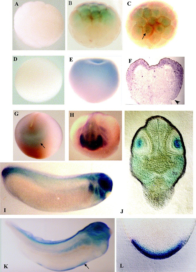 Fig. 3. The distribution of xNAP1L mRNA in embryos. Embryos were hybridised either with sense (A and D, as controls) or antisense (B, C, E, F, G, H, I, J, K) xNAP1L probes. (B and C) Lateral and animal views, respectively, of stage 6 embryos with staining predominantly in the animal half, the mRNA is consistently perinuclear (arrowed in (C)). (E and F) Whole-mount and sectioned gastrula stage embryos, xNAP1L mRNA remains mainly at the animal pole and on the section can also be seen in the involuting mesoderm, the dorsal lip is arrowed in (F). (G) Anterior view of a stage 18 embryo, the mRNA is detectable in the neural plate and also on the ventral part of the embryoposterior to the cement gland. (H) Anterior view of a stage 23 embryo, xNAP1L is expressed in the eyes, brain, neural tube and branchial arches. (I) Lateral view of a stage 26 embryo, staining is visible in the tailbud as well as the neural system, eye and branchial arches. (J) Transverse section through the posteriorhead region of a stage 30 embryo, xNAP1L mRNA levels are highest in the ectoderm but detectable also in the lens (l) and branchial arches (ba), staining is completely absent from the cement gland (cg). (K) A stage 33 embryo showing staining as before and also in the lateral plate and blood islands (arrowed). (L) Double in situ showing globin (turquoise) and xNAP1L (purple) in a transverse section of the ventral region of a stage 33 embryo, xNAP1L expression is in the ectoderm precisely overlying the v.b.i. and in its outer cells.
