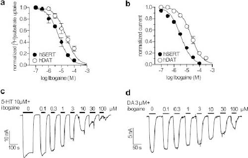 FIGURE 1. Ibogaine inhibition of transport and binding by SERT and DAT.