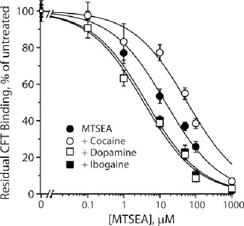 FIGURE 4. Reactivity of the DAT cytoplasmic pathway is increased by ibogaine. Ser-262 in DAT, corresponding to the cytoplasmic pathway residue Ser-277 identified in SERT, was mutated to cysteine in the X5C background (42). Membrane fragments from HeLa cells expressing DAT X5C-S262C were treated with the indicated concentrations of MTSEA for 15 min in the presence or absence of 10 μm cocaine, 10 μm DA, or 20 μm ibogaine as indicated, and then assayed for residual [3H]CFT binding as previously described for SERT (43, 54). From the MTSEA concentrations required for half-maximal inactivation, the rate constants for inactivation were 82 ± 3 s−1