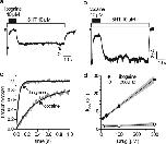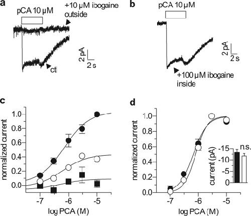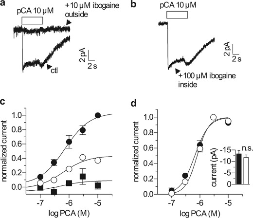 p-chloroamphetamine (a SERT substrate) was applied either in the absence (lower trace) or presence (upper trace) of 10 μm ibogaine in the extracellular medium. b, single hSERT expressing cells were voltage clamped and stimulated with PCA as in a, but with a pipette solution containing 100 μm ibogaine. c, single hSERT expressing cells were voltage clamped as in a and b and stimulated with a range of PCA concentrations. Once per minute they were challenged with a 5-s pulse of 10 μm PCA, either in the absence (filled circles) or after a 10-s pre-application of either 1 or 10 μm ibogaine (open circles and filled squares, respectively). Ibogaine reduced the maximal charge transfer to 0.44 ± 0.04 at 1 μm (n = 5) and 0.09 ± 0.08 at 10 μm (n = 5), whereas the EC50 of PCA was not changed (0.72 μm (0.34–1.55 μm) control (ctl) (n = 10); 0.62 μm (0.23–1.70 μm) at 1 μm ibogaine (n = 5); 0.52 μm (0.44 nm to 62.14 μm) at 10 μm ibogaine (n = 5). d, ibogaine did not influence the concentration response when present in the intracellular pipette solution. Single hSERT expressing cells were voltage clamped and stimulated with PCA as in c using either normal pipette solution (filled circles) or pipette solution containing 100 μm ibogaine (open circles). Ibogaine did not change the EC50 of PCA when applied from the inside (0.66 μm (0.55–0.79 μm) under control (n = 10); 0.80 μm (0.69–0.93 μm) with 100 μm ibogaine inside, n = 10). The inset shows a comparison of the current amplitudes induced by 10 μm PCA both in the absence (−13.3 pA ± 1.4 pA, filled column) and presence of 100 μm internal ibogaine (−11.7 ± 1.1 pA, open column) (p = 0.26, Mann-Whitney U test).