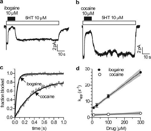 FIGURE 6. Kinetics of current block by ibogaine and cocaine. Single hSERT expressing cells were voltage clamped to −70 mm using the whole cell patch clamp technique. Cells were continuously superfused with buffer solution. a and b, for the evaluation of blocking kinetics cells were challenged with 5-HT (10 μm). 2 s after 5-HT addition, the blocking agent (ibogaine (a) or cocaine (b)) was applied for 10 s and then washed away for 60 s in the presence of 5-HT. c, comparison of the blocking kinetics of ibogaine (10 μm) and cocaine (10 μm). Gray lines indicate representative traces, and black lines show fits to the traces. d, analysis of the blocking kinetics of ibogaine (filled circles) and cocaine (open circles) over a range of concentrations. Rate constants for the development of the block were calculated over the concentration range and plotted against concentration. The black lines are linear fits through the data points and the gray areas indicate 95% confidence intervals. The slope for ibogaine was significantly different from zero (p < 0.0001 F test), 7.6 × 104 ± 0.4 × 104 s−1