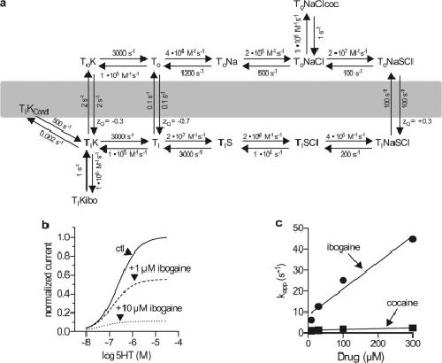 FIGURE 7. A kinetic model for cocaine and ibogaine inhibition of substrate-induced currents in SERT.