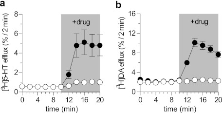 a and b, effect of ibogaine and PCA (a) or d-amphetamine (b) in a release assay. CAD cells transiently transfected with hSERT (a) or hDAT (b) were preloaded with [3H]5-HT or [3H]DA, and superfused with buffer. 2-min fractions were collected. Ibogaine (50 μm), PCA (3 μm), or d-amphetamine (3 μm) were added after six fractions (at time point 10) and five more 2-min fractions were collected (time points 12–20). Data are fractional release per 2 min in percent. Experiments were performed in quadruplicates; n = 2 (a), n = 3 (b).