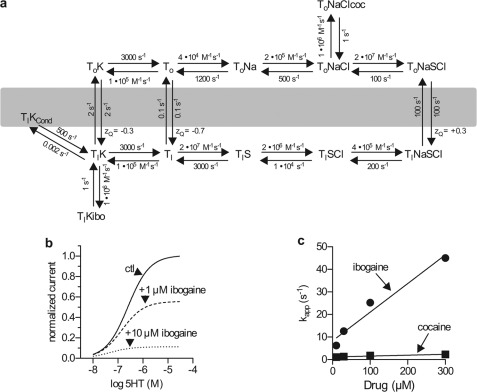 a, the model was based on a kinetic model for 5-HT-induced currents (18). KD values of 1 μm were used for both cocaine (coc) and ibogaine (ibo) (4, 36). 5-HT is represented as S. Although cocaine binds in the absence of NaCl, and its affinity is not increased by Cl− (36), binding was arbitrarily assigned to the ToNaCl intermediate to avoid undue complexity in the model. See supplemental data for a more complete analysis of the model. The slow K+-independent conversion of Ti to To is likely to represent H+ export as described previously (45). The conducting state is shown as TiKCond (18). b and c, simulations based on the model in a. b, simulated current amplitudes as a function of substrate concentration in the absence and presence of 1 and 10 μm ibogaine. c, simulated association rate constants (kapp) for ibogaine and cocaine as a function of their concentration.