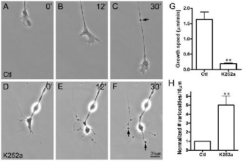 Figure 3. Effect of Trk inhibition on axonal growth.Spinal neurons were incubated in control medium (A–C) or medium containing 500 nM K252a (D–F). The growth speeds of axons were measured from images taken during time-lapse recordings. Treatment with K252a led to a significant reduction in axonal growth speed (G) and also to the elaboration of the distal end of the axon into a web of interconnecting neurites and varicosities within 30 min. Although varicosities were also observed along control axons and were often associated with filopodia (arrow in C), they were much more numerous within the distal neuritic web generated after K252a treatment (arrows in F and quantified in H). Mean and SEM shown; t test: **p<0.01, compared with untreated Ctl.