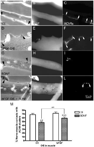 Figure 7. Reciprocal regulation of NMJ formation by bFGF/NT-signaling.Normal spinal neurons were cocultured with muscle cells expressing GFP (A–C and G–I) or GFP plus bFGF (bFGF O/E; D–F and J–L) and maintained in control medium (A–F) or medium with added BDNF (G–L). Neurons induced AChR clusters equally well in GFP- and bFGF-muscle cells (C, F), and BDNF-treatment inhibited synaptic AChR clustering in both cases (I, L). The inhibitory effect of BDNF, however, was weaker when muscle cells expressed excess bFGF, and in these cases nerve-muscle contacts with AChR were more readily found (L). Muscle cells in which nerves induced new AChR clusters lacked spontaneously occurring AChR aggregates (also called hot-spots); when AChR aggregation at innervation sites was compromised, AChR hot-spots were retained (h.s. in panel I). Synaptogenesis was quantified in terms of the percentages of nerve-muscle contacts with AChR clusters (M). Mean and SEM shown; t test: **p<0.01 and ***p<0.001, compared to cocultures with normal muscle cells; ??p<0.01, compared with BDNF-treated cocultures using bFGF-overexpressing muscle cells. Arrowheads point to nerve tracks, arrows to nerve-induced AChR clusters.