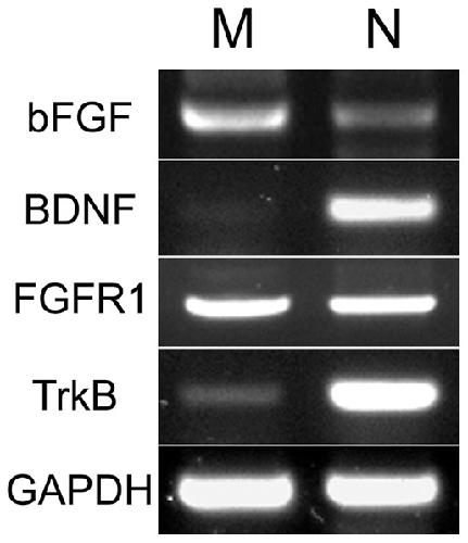 Figure 1. Expression of bFGF/FGFR1 and BDNF/TrkB in Xenopus nerve and muscle.These agarose gel photographs show RT-PCR-generated fragments from mRNAs of bFGF, BDNF, FGFR1, TrkB and GAPDH in neural tubes (N) and myotomes (M) isolated from Xenopus embryos. GAPDH was used as an amplification and loading control.