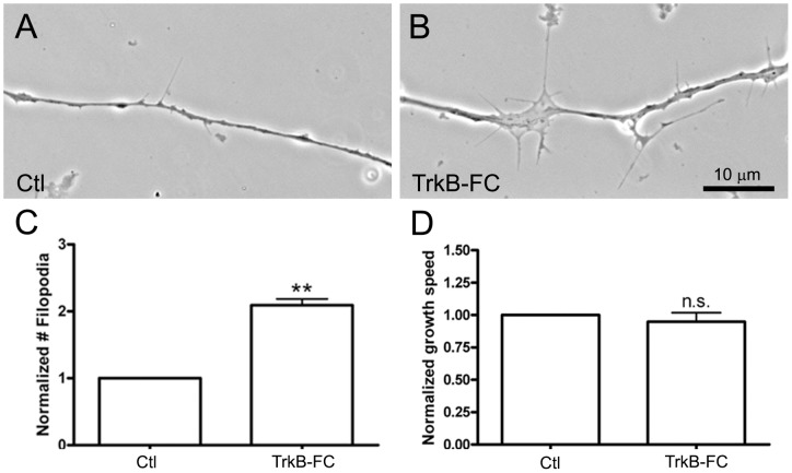 Figure 2. Influence of BDNF-depletion on the formation of axonal filopodia.Spinal neurons were incubated in (A) control medium or (B) medium containing 1 µg/ml TrkB-FC. Axonal filopodial formation was examined 18 h after plating the neurons. Bath application of TrkB-FC enhanced the formation of axonal filopodia, which is quantified in terms of filopodial densities (C). The density of filopodia (#filopodia/10 µm axon) in TrkB-FC-treated neurons was normalized against that in control neurons. In the presence of TrkB-FC, no significant difference in the speed of axonal outgrowth was observed (D). Mean and SEM shown; t test: **p<0.01, compared with untreated Ctl.