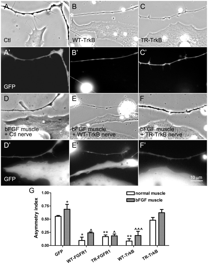 Figure 6. The influence of TrkB signaling on filopodial extension by neurons towards muscle.Nerve-muscle cocultures were prepared using neurons expressing GFP (A and A'), WT-TrkB (B and B') or TR-TrkB (C and C'). WT-TrkB-neurons, unlike control neurons, displayed little bias in the extension of filopodia towards muscle, but the TR-TrkB-neurons, which grew more filopodia than GFP-neurons, were able to send out filopodia preferentially in the direction of muscle. (D–F') On muscle cells expressing GFP plus bFGF, neurons expressing GFP (D and D') or TrkB proteins (E–F') were seeded. GFP-neurons extended even more filopodia towards muscle cells overexpressing bFGF (D and D') than towards normal muscle cells (A and A'). WT-TrkB-neurons once again grew fewer filopodia than GFP-neurons, but the bFGF-overexpressing muscle cells induced more filopodia in WT-TrkB-neurons (E and E') than control muscle cells (above). TR-TrkB-neurons also extended more filopodia towards bFGF-expressing muscle cells (F and F') than towards control cells. (G) Calculation of AI values for these cocultures as well as for those cultures in which neurons expressed FGFR1 proteins (pictures not shown). Asymmetric distribution of filopodia was slightly improved in neurons expressing WT-TrkB, TR-TrkB and WT-FGFR1, but not TR-FGFR1. Mean and SEM shown; t test: *p<0.05 and **p<0.01, compared to cocultures between Ctl neurons and normal muscle cells; ?p<0.05 and ???p<0.001, compared to cocultures made between Ctl neurons and bFGF-overexpressing muscle cells.