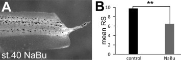 Fig. 3. Sodium butyrate (NaBu) inhibits tail regeneration in Xenopus laevis. (A) Example 0.5 mg/ml NaBu treated embryotail shown five days after amputation of 30â50% of the tail and allowed to regenerate showing partial regeneration (compare to control regeneration in Fig. 1E). Arrowheads indicate the approximate cut site. NaBu treated stage 40 tadpoles do not show a âpoodleâ phenotype. (B) Bar graph showing mean tail regeneration score out of ten (mean RS) in stage 40 tadpoles treated with 0.5 mg/ml NaBu compared to untreated controls. (ââIndicates t-test p value of <0.01). Full data and analysis is shown in Table 2.