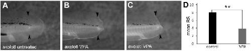 Fig. 4. VPA inhibits tail regeneration in stage 46 Ambystoma mexicanum. (AâC) stage 46 axolotl larvae tails shown 7 days after amputation of the posterior third of the tail. Arrowheads indicate the approximate cut site (A) untreated tail showing full regeneration. (B) Tail of axolotl larva treated with 0.2 mg/ml VPA post amputation showing example of partial regeneration. (C) Tail of axolotl larva treated with 0.2 mg/ml VPA post amputation showing example of failed regeneration. (D) Bar graph showing mean tail regeneration score out of ten (mean RS) in stage 46 axolotl larvae treated with VPA (0.2 mg/ml) compared to untreated controls. (ââIndicates t-test p value of <0.01). Full data and analysis is shown in Table 4.