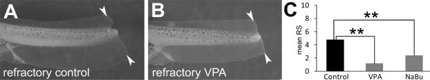 Fig. 2. HDAC inhibitors further inhibit tail regeneration in refractory stage Xenopus laevis. Stage 46/47 tadpoles are normally unable to regenerate tails following partial amputation. (A and B) Tadpole tails shown five days after amputation of the posterior 30â50% during the refractory period. White arrowheads indicate approximate level of amputation. (A) Example of failed regeneration in control, untreated tadpole. (B) Representative tadpole treated with 0.2 mg/ml VPA. (C) Bar graph showing mean tail regeneration score out of ten (mean RS) in refractory stage tadpoles. Despite the low background regeneration in controls at this stage, treatment with VPA or NaBu still significantly inhibited regeneration (ââIndicates t-test p value of <0.01). Full data and analysis is shown in Table 3.