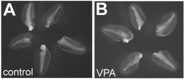 Fig. 7. VPA does not inhibit tail development in Xenopus laevis: Stage 32 tail buds were extirpated and cultured in the absence (A) or presence (B) of 0.2 mg/ml VPA for 24 h until stage 40 (stage of photographs) Both cohorts exhibited normal automomous development of the somites, spinal cord, notochord and fin.