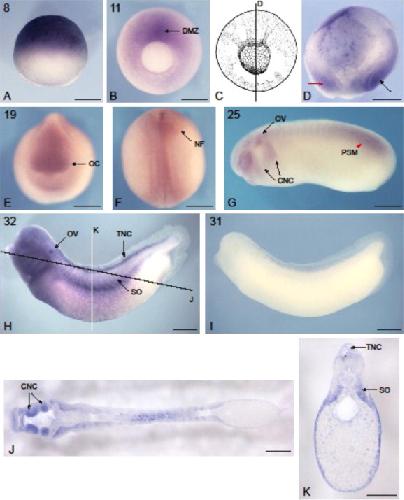 Fig. 4. Expression of Tspan3 during Xenopus development. (A, B and EâH) Whole mount in situ hybridization of Tspan3 encoding gene Tm4sf8 on stage 8â32 Xenopus embryos as indicated. (I) Control in situ hybridization with sense probe for Tm4sf8 at stage 32. Vegetal views (AâC), anterior view (E), dorsal view, anterior to up (F), lateral views, anterior to left (GâI). (C) Schematic representation of a stage 11.5 embryo modified from Nieuwkoop and Faber (1967). (D) Semi-sections of embryos shown in C as indicated. (J and K) Vibratome sections of embryos shown in H as indicated. CNC = cranial neural crest, DMZ = dorsal marginal zone, NF = neural fold, OC = optic cup, OV = otic vesicle, PSM = pre-somitic mesoderm, SO = somites, TNC = trunk neural crest. Scale bar 450 μm (AâI) and 100 μm (J and K).