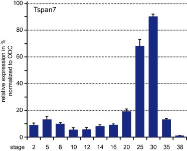 Fig. 7. Real-time RT-PCR analysis of Tspan7 expression in different embryonic stages. The total RNA was isolated from the group of 10 embryos on the corresponding stage of development. Samples were normalized to levels of ornithine decarboxylase (ODC). Error bars indicate standard error.
