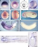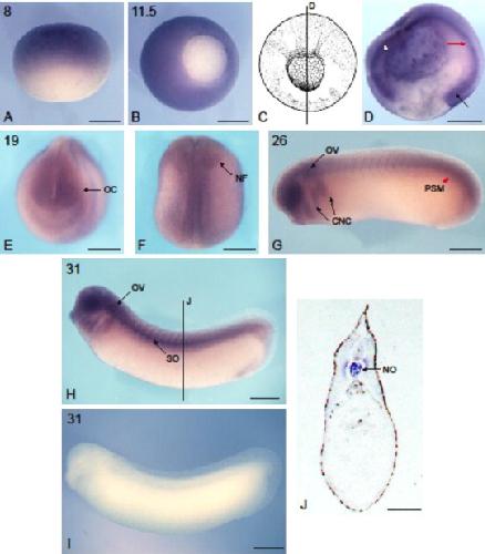 Fig. 8. Expression of Tspan7 during Xenopus development. (A, B and EâH) Whole mount in situ hybridization of Tspan7 encoding gene Tm4sf2 on stage 8â31 Xenopus embryos as indicated. (I) Control in situ hybridization with sense probe for Tm4sf2 at stage 31. Vegetal views (AâC), anterior view (E), dorsal view, anterior to up (F), lateral views, anterior to left (GâI). (C) Schematic representation of a stage 11.5 embryo modified from Nieuwkoop and Faber (1967). (D) Semi-sections of embryos shown in C as indicated. (J) Vibratome section of embryo shown in H as indicated. CNC = cranial neural crest, NF = neural fold, OC = optic cup, OV = otic vesicle, PSM = pre-somitic mesoderm, SO = somites, NO = notochord. Scale bar 450 μm (AâI) and 100 μm (J).