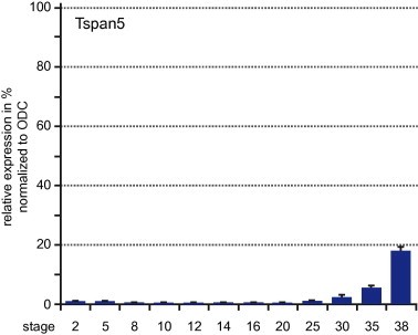 Fig. 9. Real-time RT-PCR analysis of Tspan5 expression in different embryonic stages. The total RNA was isolated from the group of 10 embryos on the corresponding stage of development. Samples were normalized to levels of ornithine decarboxylase (ODC). Error bars indicate standard error.