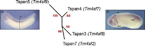 Tetraspanins comprise a large family of integral membrane proteins involved in the regulation of cell adhesion, migration and fusion. In humans it consists of 33 members divided in four subfamilies. Here, we examined the spatial and temporal gene expression of four related tetraspanins during the embryonic development of Xenopus laevis by quantitative real-time PCR and in situ hybridization: Tspan3 (encoded by the gene Tm4sf8 gene) Tspan4 (encoded by the gene Tm4sf7), Tspan5 (encoded by the gene Tm4sf9) and Tspan7 (encoded by the gene Tm4sf2). These genes appeared first in the vertebrates during the evolution and are conserved across different species. In humans, they were associated with several diseases such as sclerosis, mental retardation and cancer; however their physiological role remained unclear. This work provides a comprehensive comparative analysis of the expression of these tetraspanins during the development of X. laevis. The more closely related tetraspanins Tspan3, Tspan4 and Tspan7 exhibited very similar spatial expression patterns, albeit differing in their temporal occurrence. The corresponding transcripts were found in the dorsal animal ectoderm at blastula stage. At early tailbud stages (stage 26) the genes were expressed in the migrating cranial neural crest located in the somites, developing eye, brain, and in otic vesicles. In contrast, Tspan5 appeared first at later stages of development and was detected prominently in the notochord. These data support close relatedness of Tspan3, Tspan4 and Tspan7. The expression of these tetraspanins in the cells with a high migratory potential, e.g. neural crest cells, suggests their role in the regulation of migration processes, characteristic for tetraspanin family members, during development. Similarity of the expression profiles might indicate at least partial functional redundancy, which is in concordance with earlier findings of tissue-limited or absent phenotypes in the knock-down studies of tetraspanins family members performed.