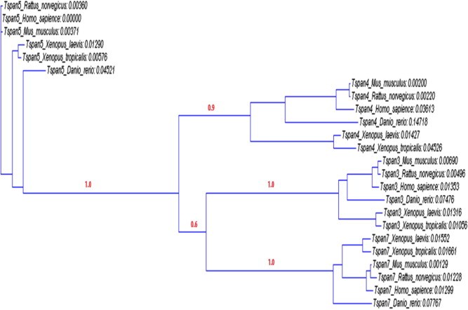Fig. 2. Phylogenetic analysis of the tetraspanins Tspan3, Tspan4, Tspan5 and Tspan7. The phylogram was generated using ClustalW2 algorithm on the EBI public server http://www.ebi.ac.uk/Tools/phylogeny/clustalw2_phylogeny/ and includes Danio rerio, Xenopus laevis, Xenopus tropicalis, Mus musculus, Rattus norvegicus and Homo sapiens homologs of the tetraspanins analyzed.