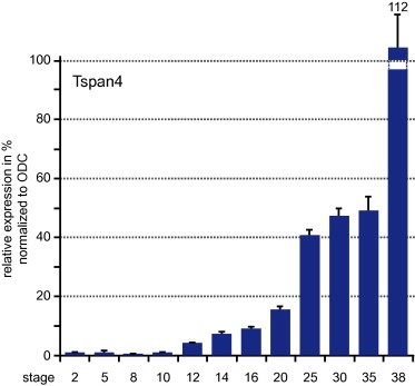 Fig. 5. Real-time RT-PCR analysis of Tspan4 expression in different embryonic stages. The total RNA was isolated from the group of 10 embryos on the corresponding stage of development. Samples were normalized to levels of ornithine decarboxylase (ODC). Error bars indicate standard error.