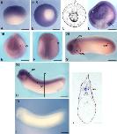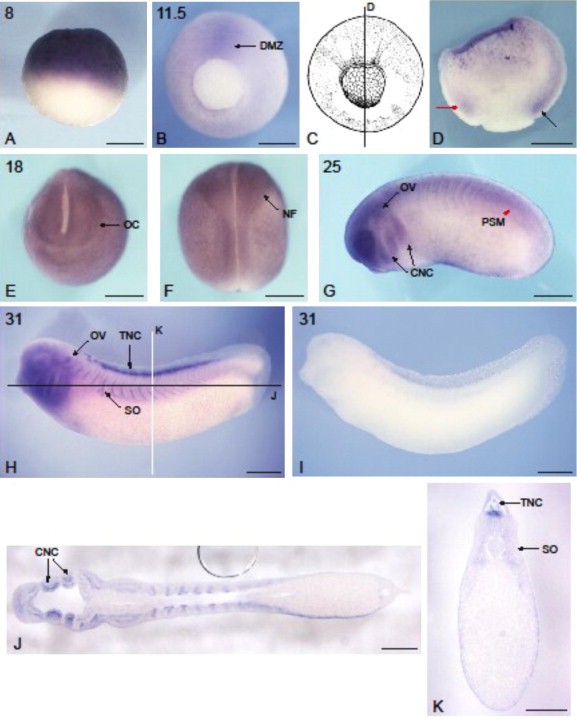 Fig. 6. Expression of Tspan4 during Xenopus development. (A, B and EâH) Whole mount in situ hybridization of Tspan4 encoding gene Tm4sf7 on stage 8â31 Xenopus embryos as indicated. (I) Control in situ hybridization with sense probe for Tm4sf7 at stage 31. Vegetal views (AâC), anterior view (E), dorsal view, anterior to up (F), lateral views, anterior to left (GâI). (C) Schematic representation of a stage 11.5 embryo modified from Nieuwkoop and Faber (1967). (D) Semi-sections of embryos shown in C as indicated. (J and K) Vibratome sections of embryos shown in H as indicated. CNC = cranial neural crest, DMZ = dorsal marginal zone, NF = neural fold, OC = optic cup, OV = otic vesicle, PSM = pre-somitic mesoderm, SO = somites, TNC = trunk neural crest. Scale bar 450 μm (AâI) and 100 μm (J and K).