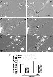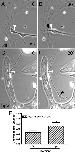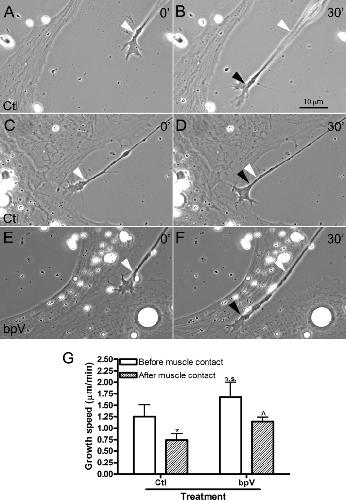 FIGURE 2:. Enhancement of axonal growth by the PTEN-inhibitor bpV. Elongating axons in Xenopus nerve–muscle cocultures were examined by time-lapse recordings. The sample images here show axonal growth over 30 min in control cocultures before contact with muscle (Ctl; A and B) and after (Ctl; C and D), and growth after muscle contact in cocultures treated with a PTEN-inhibitor (bpV, 100 nM; E and F). In both control and bpV-treated cultures, axonal growth slowed after touching muscle, but axons exposed to bpV advanced ∼50% faster than control axons. The axon–growth cone position is marked by a white arrowhead at time zero (0′) and by a black arrowhead at 30 min (30′). In 30 min, the control axon advanced 25 μm before target contact (A and B) but <5 μm after contact (C and D). In contrast, addition of bpV caused the axon to grow 23 μm in 30 min after muscle contact (E and F). (G) Quantification of axonal growth speeds in μm/min using distances axons advanced in control and bpV-treated cultures before and after contact with muscle. Mean ± SEM shown; number of axons examined by time-lapse recording: 10 (Ctl-before contact), 12 (Ctl-after contact), 22 (bpV-before contact), 39 (bpV-after contact); t test: *, p = 0.01, relative to control axons before contact with muscle; ^, p = 0.03 compared with control axons after muscle contact; n.s., not significant. For the difference between Ctl-before contact and bpV-before contact, p = 0.17.