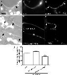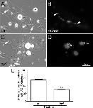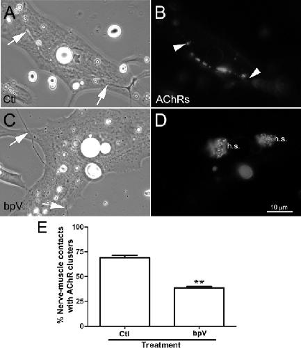 FIGURE 6:. Inhibition of NMJ formation by the PTEN-blocker bpV. NMJ formation in 1-d-old nerve–muscle cocultures (A and C) was examined by labeling AChR clusters with R-BTX (B and D). In control cocultures, AChRs were aggregated in muscle cells at innervation sites (B), but in bpV-treated cultures, nerve-induced AChR clustering was significantly reduced (D) and spontaneously formed AChR clusters or hot spots (h.s.) persisted; arrows point to axon–muscle contacts, arrowheads to nerve-induced AChR clusters. (E) NMJ assembly was quantified as percentages of nerve–muscle contacts with AChR clusters; mean ± SEM shown; t test: **, p < 0.01. Number of nerve–muscle pairs examined: 105 (Ctl), 104 (bpV).
