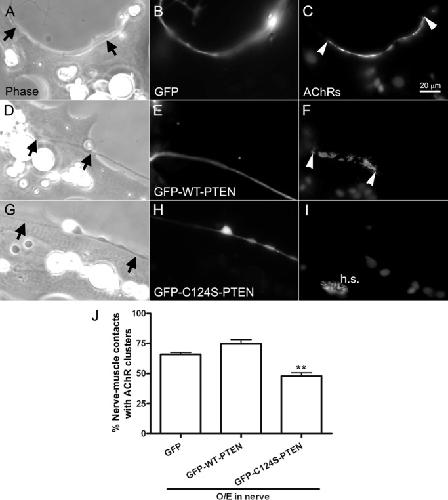 FIGURE 8:. Reduction in NMJ development following the expression of inactive PTEN in neurons. Spinal neurons expressing GFP (A and B), GFP-WT-PTEN (D and E), or GFP-C124S-PTEN (G and H) were cocultured with normal muscle cells. R-BTX labeling showed that neurons expressing GFP (C) or WT-PTEN (F) induced AChR clustering better than those expressing C124S-PTEN (I). Arrows mark nerve tracks (A, D, and G); arrowheads point to AChR clusters at innervation sites in muscle (C and F); h.s. indicates an AChR hot spot (I); and GFP fluorescence shows the expression of exogenous proteins in neurons (B, E, and H). Quantification of NMJ formation (J) showed that GFP- and WT-PTEN neurons induced AChR clusters at 70–75% of innervation sites, whereas neurons with inactive PTEN triggered AChR aggregation at <50% of the sites at which they contacted muscle cells; mean ± SEM; t test: **, p < 0.01 relative to AChR cluster induction by GFP neurons. Number of nerve–muscle pairs examined: 53 (GFP), 45 (GFP-WT-PTEN), 87 (GFP-C124S-PTEN).