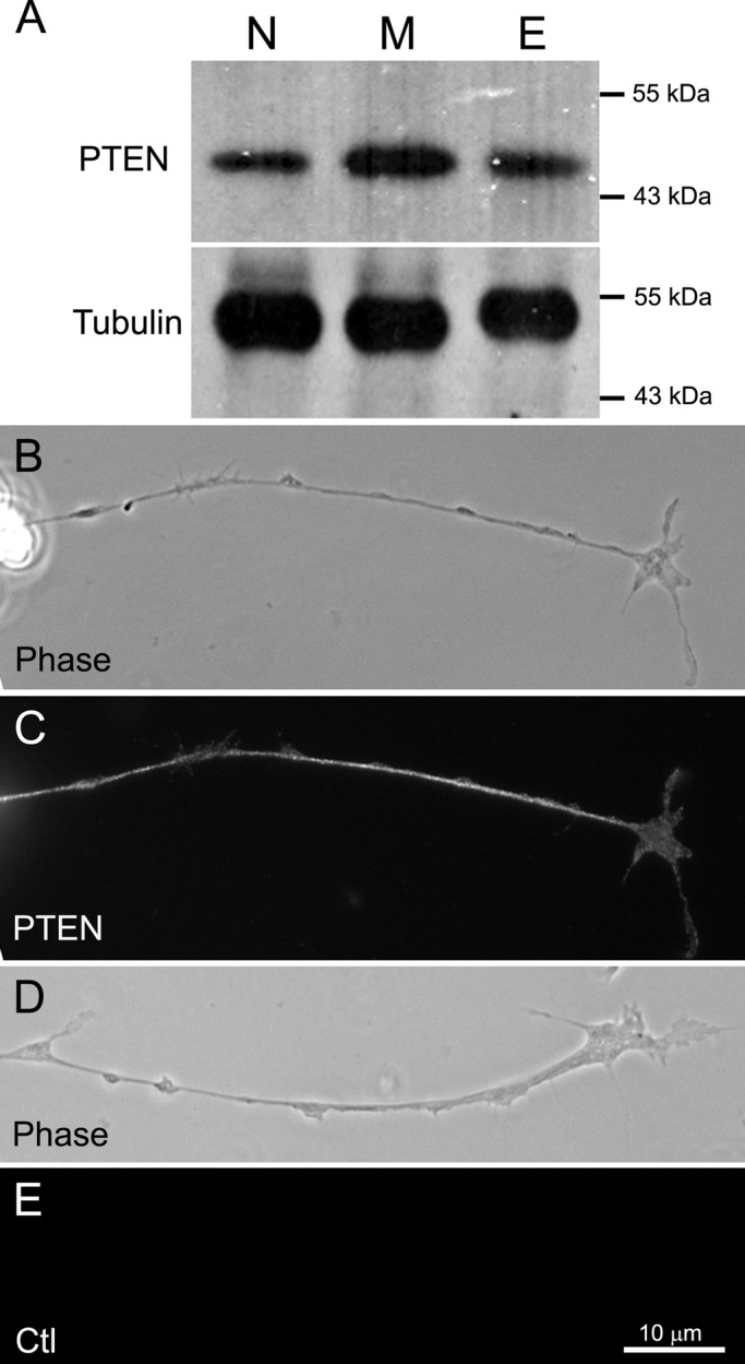 FIGURE 1:. Expression of PTEN in embryonic Xenopus spinal neurons. (A) PTEN expression in Xenopus tissues was assessed by immunoblotting. Extracts of Xenopus neural tubes (N), myotomal muscle (M), and whole embryos (E) were stained with an anti-PTEN antibody (top blot) and with anti-tubulin antibody to compare protein loading (bottom blot). Molecular weight marker positions are indicated on the right. (B–E) PTEN expression in neurons was examined by immunolabeling. Fixed and permeabilized embryonic spinal neurons were labeled with anti-PTEN and FITC-conjugated secondary antibodies (PTEN; B and C) or secondary antibodies alone (Ctl; D and E). Labeling for PTEN was detected along axons and also in growth cones (C).