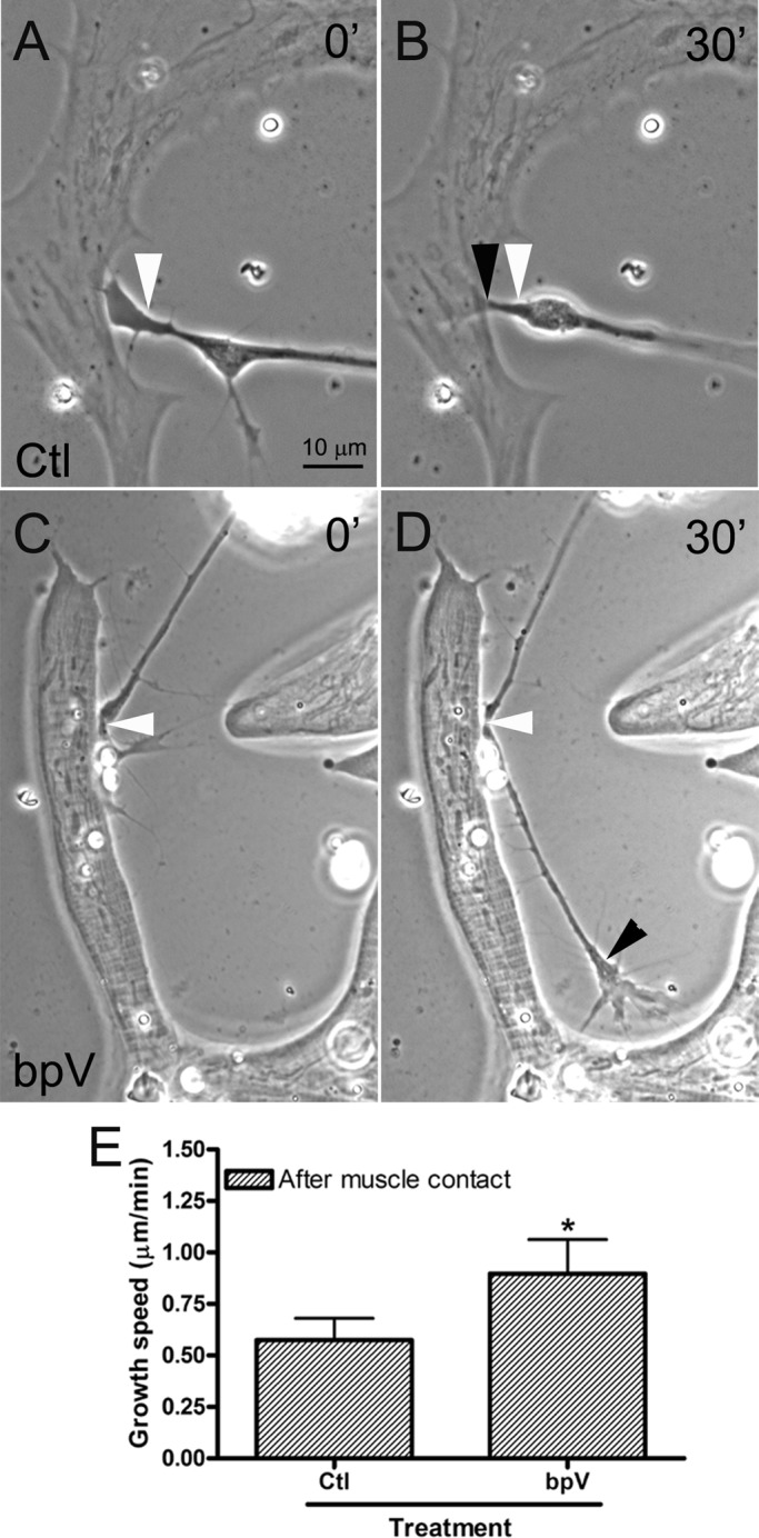 FIGURE 3:. Effect of bpV on axonal growth after NMJ formation. Spinal neurons were seeded on muscle cultures to allow NMJ formation. After 12–16 h, control or 100 nM bpV-containing medium was added to the cocultures. (A and B) In control cultures, little growth of the axon was seen at nerve–muscle contact sites within 30 min, but in bpV-treated cultures (C and D), axons were observed to resume active growth during the 30-min recording period. (E) Quantification of axonal growth speeds in untreated (Ctl) and bpV-treated cocultures. Mean ± SEM; t test: *, p = 0.05 compared with Ctl. Arrowheads indicate initial and final positions of the terminal ends of axonal shafts (A–D). Number of axons examined by time-lapse recording: 16 (Ctl-after contact), 11 (bpV-after contact).