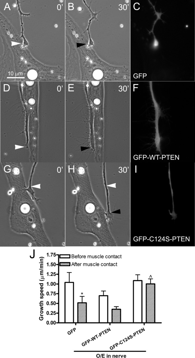 FIGURE 5:. Regulation of axonal advance by exogenous PTEN proteins. Spinal neurons were cultured from Xenopus embryos injected with mRNAs encoding GFP (A–C) and GFP-tagged wild-type PTEN (GFP-WT-PTEN; D–F) or catalytically inactive PTEN (GFP-C124S-PTEN; G–I). These neurons were seeded on muscle cells cultured from uninjected embryos, and axonal growth was monitored by time-lapse imaging. After contact with muscle cells, axons overexpressing wild-type PTEN grew more slowly than control GFP axons, whereas axons expressing inactive PTEN grew faster. The advance of axons can be compared using the arrowheads that mark the terminal ends of growth cones; the expression of exogenous proteins in the axons is shown by GFP fluorescence (C, F, and I). (J) The average growth speeds of axons (expressing exogenous proteins) before and after muscle contact were quantified and are shown as mean ± SEM. t test: *, p = 0.04 relative to GFP axons before muscle contact; ^, p = 0.02 compared with GFP axons after contact with muscle. Number of axons examined by time-lapse recording: 7 (GFP-before contact), 11 (GFP-after contact), 12 (GFP-WT-PTEN-before contact), 17 (GFP-WT-PTEN-after contact), 18 (GFP-C124S-PTEN-before contact), 25 (GFP-C124S-PTEN-after contact).