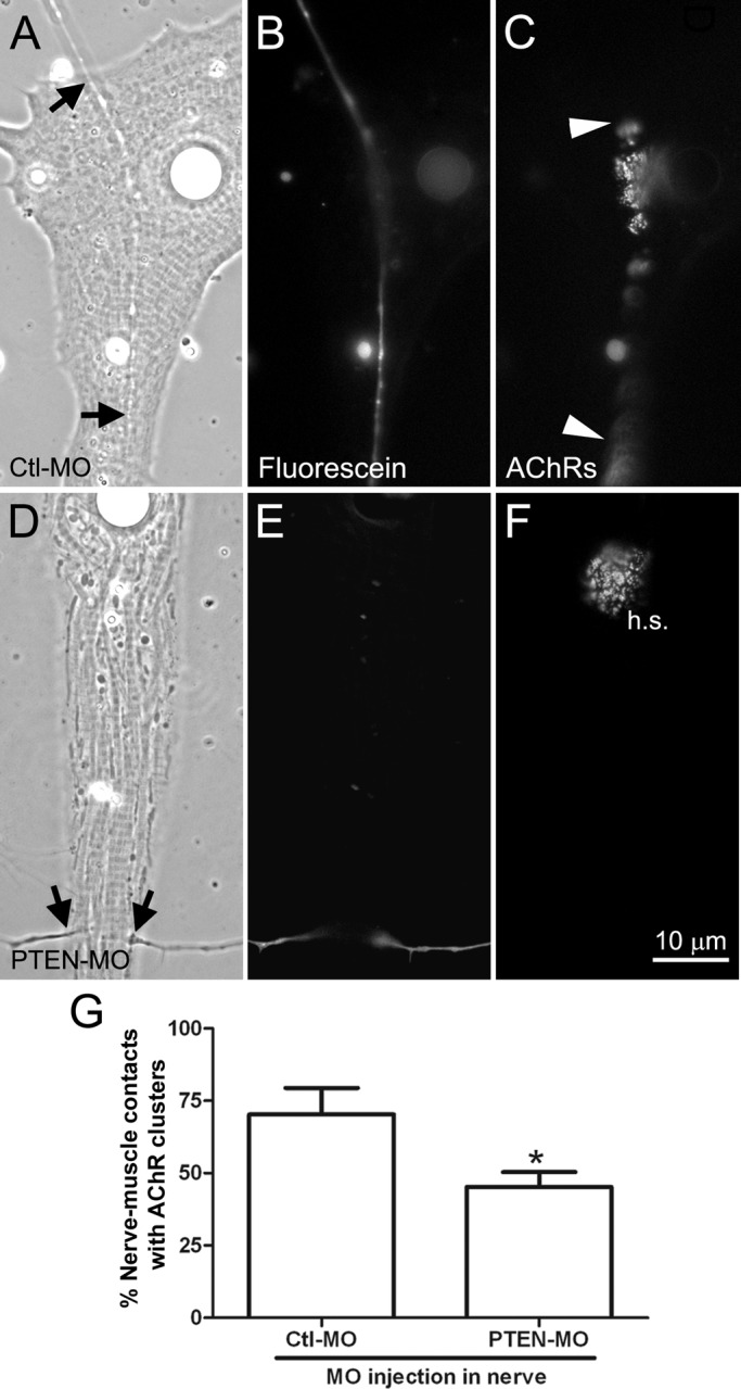 FIGURE 7:. Suppression of NMJ assembly by the down-regulation of neuronal PTEN expression. Spinal neurons from embryos injected with Ctl-MO (A and B) or PTEN-MO (D and E) were cocultured with muscle cells from uninjected embryos; nerve-induced clustering of AChRs was examined by R-BTX labeling (C and F). AChR aggregation at innervation sites was reduced in cocultures using neurons with PTEN-MO compared with those with Ctl-MO, and AChR hot spots (h.s.) were retained in muscle cells innervated by the PTEN-MO neurons (F). Arrows indicate axon–muscle contacts (A and D); green fluorescence shows the presence of fluorescein-tagged MOs in neurons (B and E); and arrowheads mark nerve-induced AChR clusters (C). Quantification of muscle AChR clustering at innervation sites (G) showed that NMJ formation was reduced by ∼40% in cocultures using PTEN-MO neurons compared with those with Ctl-MO neurons; mean ± SEM; t test: *, p = 0.01. Number of nerve–muscle pairs examined: 53 (Ctl-MO), 68 (PTEN-MO).