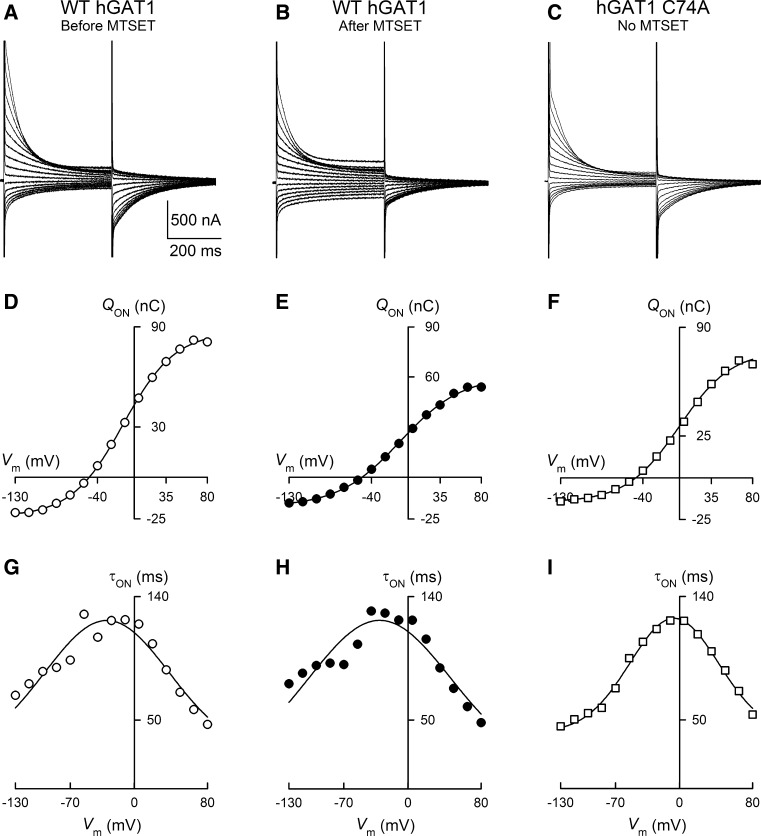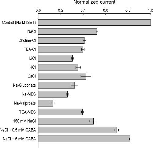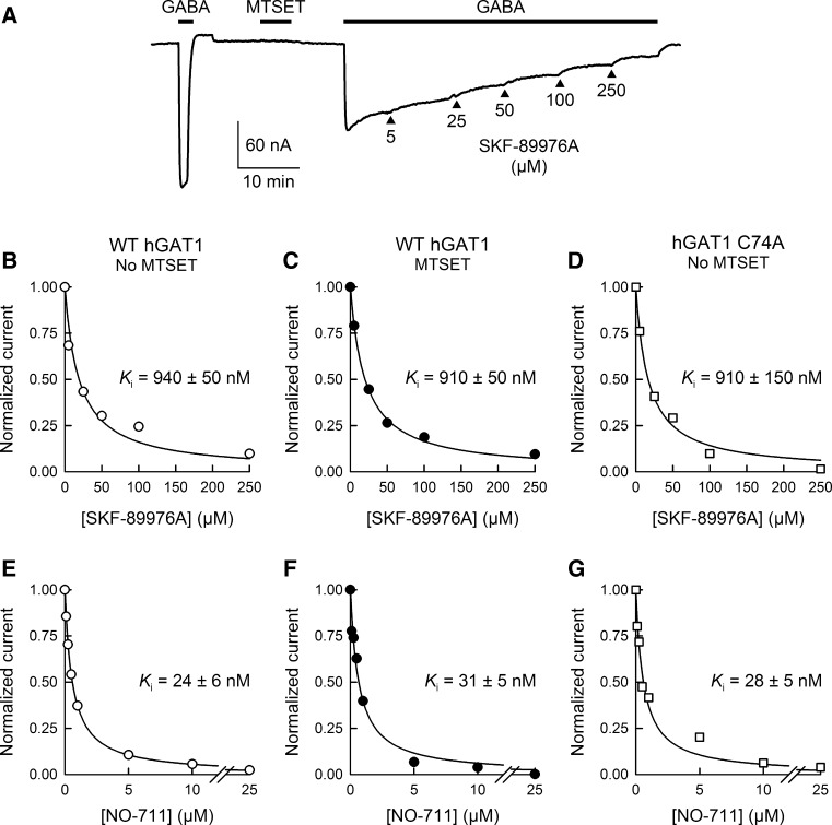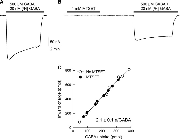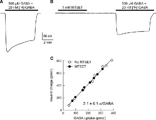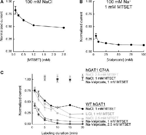 The aims of this study were to optimize the experimental conditions for labeling extracellularly oriented, solvent-exposed cysteine residues of γ-aminobutyric acid transporter 1 (GAT1) with the membrane-impermeant sulfhydryl reagent [2-(trimethylammonium)ethyl]methanethiosulfonate (MTSET) and to characterize the functional and pharmacological consequences of labeling on transporter steady-state and presteady-state kinetic properties. We expressed human GAT1 in Xenopus laevis oocytes and used radiotracer and electrophysiological methods to assay transporter function before and after sulfhydryl modification with MTSET. In the presence of NaCl, transporter exposure to MTSET (1-2.5 mM for 5-20 min) led to partial inhibition of GAT1-mediated transport, and this loss of function was completely reversed by the reducing reagent dithiothreitol. MTSET treatment had no functional effect on the mutant GAT1 C74A, whereas the membrane-permeant reagents N-ethylmaleimide and tetramethylrhodamine-6-maleimide inhibited GABA transport mediated by GAT1 C74A. Ion replacement experiments indicated that MTSET labeling of GAT1 could be driven to completion when valproate replaced chloride in the labeling buffer, suggesting that valproate induces a GAT1 conformation that significantly increases C74 accessibility to the extracellular fluid. Following partial inhibition by MTSET, there was a proportional reduction in both the presteady-state and steady-state macroscopic signals, and the functional and pharmacological properties of the remaining signals were indistinguishable from those of unlabeled GAT1. Therefore, covalent modification of GAT1 at C74 results in completely nonfunctional as well as electrically silent transporters.
