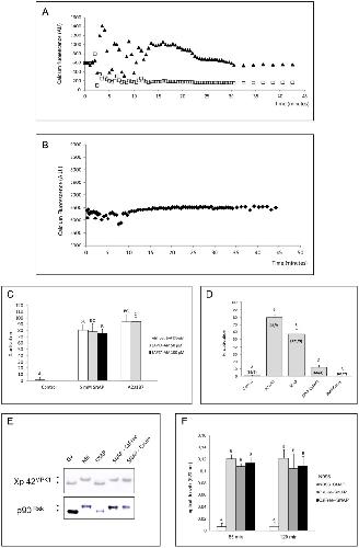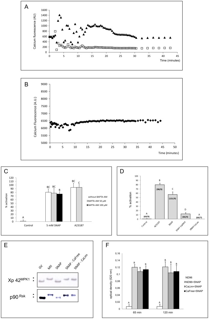 Figure 4. SNAP induced parthenogenetic activation is calcium-dependent.Effects of 5 mM SNAP application on mature oocyte in ND96 (black triangles) or in ND96 with 50 µM BAPTA-AM (white squares) (A) or in presence of CPTIO (B). Typical results are depicted. Fluorescence was expressed in arbitrary units and background and auto-fluorescence were subtracted. SNAP superfusion, which started at time â=â5 minutes, was responsible for a rise of intracellular calcium fluorescence. The latter was abolished by presence of CPTIO (C) Effect of calcium chelator on SNAP induced activation. Histogram showing percentages of activated oocytes after 2 hours treatment with 5 mM SNAP or 10 uM A23187 supplemented 50 µM or 100 µM BAPTA-AM. Oocyte in control group were treated for 2 hours in clear ND96. Error bands represent ±SEM values. Different superscripts indicate significant diferences (P<0.05). Data are shown as mean percentage of activation of minimally four independent experiments. (D) Percentages of parthenogenetic activated oocytes after 2 hours treatment with 5 mM SNAP in ND96 medium, calcium free medium (CaFree) and calcium limited medium (CaLim). Error bands represent ±SEM values. Different superscripts indicate significant differences (P<0.05). Data are shown as mean percentage of activation of minimally four independent experiments. (E) Western blot analysis. After 2 hours oocytes were taken off, homogenized in lysis buffer, and immunoblotted with antibodies against Xp42Mpk1 and p90Rsk. (F) Releasing of nitric oxide in calcium restricted mediums. Nitric oxide contents after SNAP treatment was determined in ND96, CaLim and CaFree mediums by colorimetric measurement of NO nitric oxide metabolites, nitrites and nitrates (NO3â/NO2). Each measurement was repeated three times. Different superscripts indicate significant differences (P<0.05). |