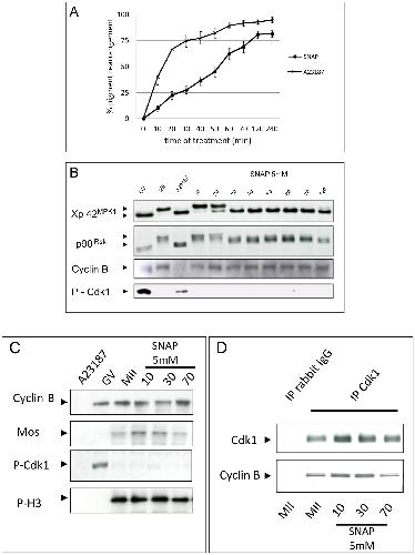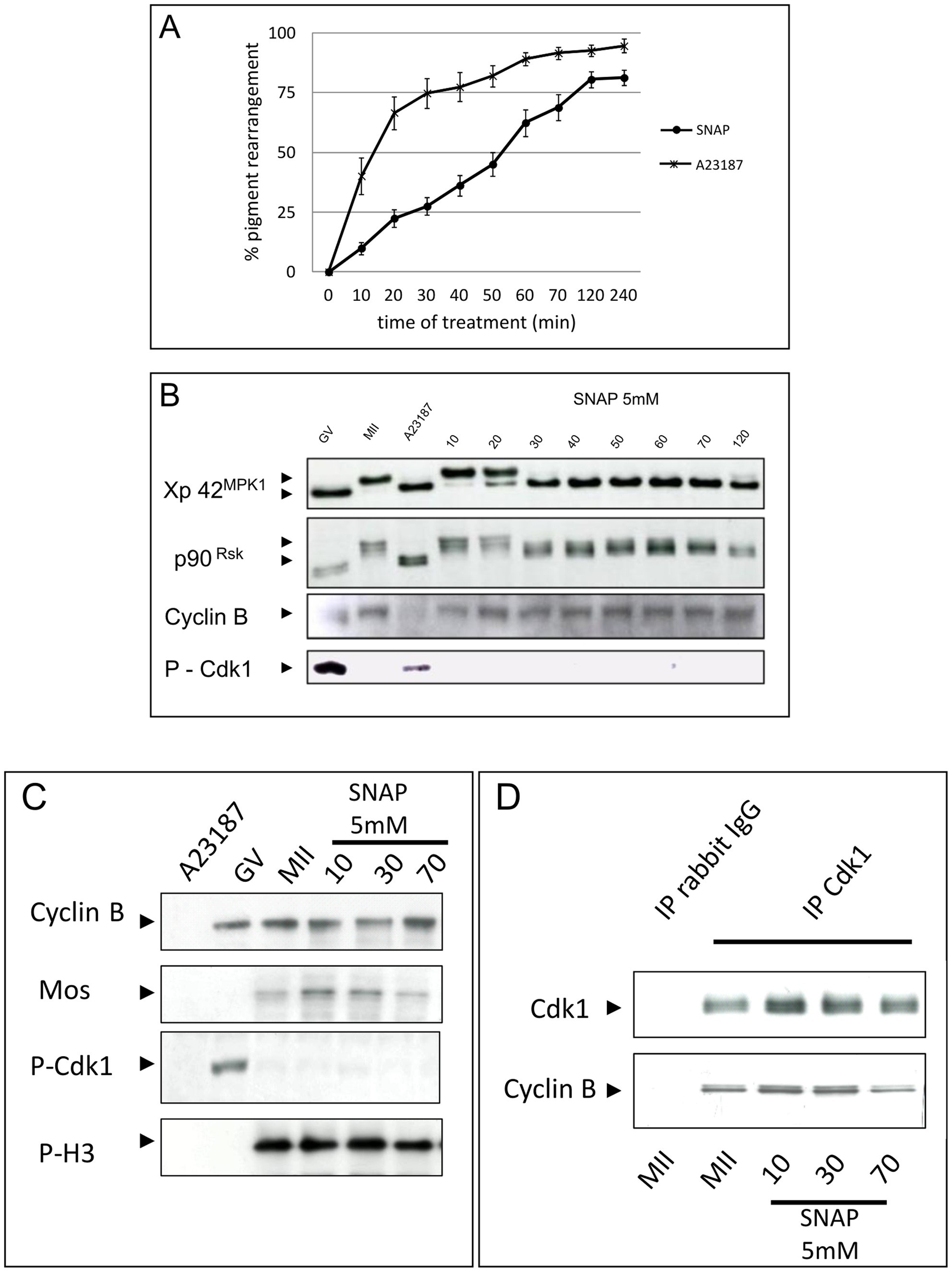 Figure 2. Kinetic of SNAP induced activation. (A) Kinetic of parthenogenetic activation after SNAP treatment. Matured oocytes were cultured with 5 mM SNAP or 10 A23187; cortical reaction was scored at 10 minutes time intervals. Data are shown as mean percentage of activation SEM of five independent experiments. (B) Western blot analysis. Each time 5 oocytes were taken off, homogenized in lysis buffer, and immunoblotted with antibodies against Cyclin B, P-Tyr15 Cdk1, Xp42Mpk1 and p90Rsk. (C) Western blot analysis. Neither Cyclin B or Mos were degraded in SNAP-treated matured oocytes (both were still detected 70 min after the beginning of the treatment); MPF activity was attested by its ability to phosphorylate histone H3. It is to note that Cdk1 remained unphosphorylated at tyrosine 15. (D) Immunoprecipitation. Cdk1 and Cyclin B are complexed together i metaphase II arrested oocytes. SNAP did not induce any separation between the two partners of the MPF heterodimer, even after 70 minutes. |