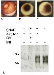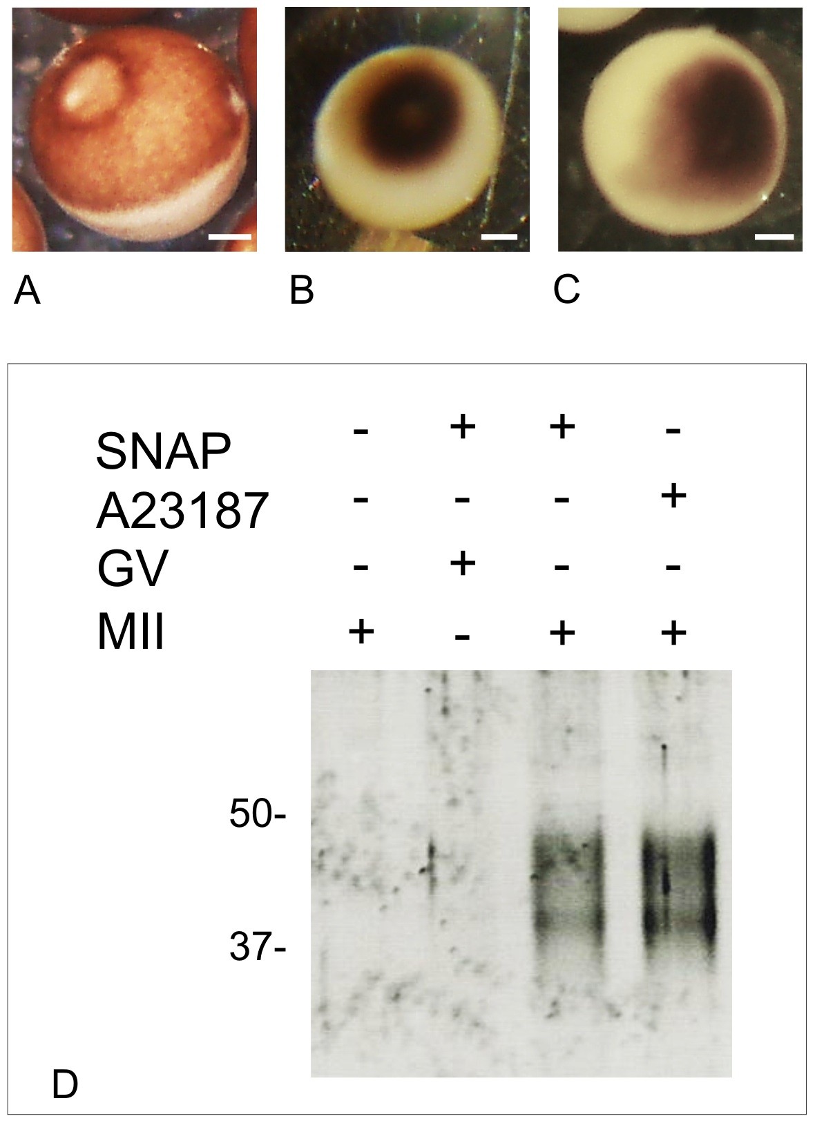 Figure 1. Nitric oxide donor SNAP induces cortical reaction typical of parthenogenetic activation in Xenopus laevis matured oocytes. (A) Typical morphologies of Xenopus laevis oocytes in control batches, arrested in metaphase II, (B) following parthenogenetic activation by A23187 treatment or (C) following SNAP treatment. Scale bars represent 200 . (D) SNAP treatment induces release of cortical granule lectins from Xenopus oocytes. Oocytes were incubated for 1 hour without or with 5 mM SNAP or 10 A23187. After 1 hour the fluid surrounding oocytes (15 ) was collected for analysis by SDS-PAGE and SYPRO Ruby staining. Molecular weight standards are indicated in kDa. |