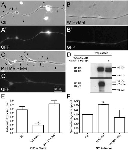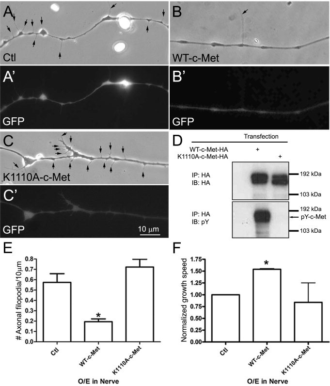 Figure 3. Suppression of filopodial formation and enhancement of axonal growth by c-Met overexpression in neurons. Spinal neurons expressing GFP (A, A′), GFP and wild-type c-Met (WT-c-Met; B, B′), or GFP and kinase-dead c-Met (K1110A-c-Met; C, C′) were examined for filopodia. Compared to GFP-neurons (A), neurons expressing active c-Met (B) but not inactive c-Met (C) had fewer filopodia (arrows). This is quantified as filopodial densities in panel E; mean SEM; t-test, *P < 0.05 compared to control. D: HEK293T cells were transfected with cDNAs encoding HA-tagged WT-c-Met and K1110A-c-Met and the proteins were immunoprecipitated (IP) from cell extracts using anti-HA antibody. Immunoblotting (IB) of IP samples with anti-HA (upper blot) and anti-pY (lower blot) showed that WT-c-Met was tyrosine-phosphorylated (pY-c-Met) but kinase-dead c-Met was not. F: Spinal neurons expressing GFP, GFP plus WT-c-Met, and GFP plus K1110A-c-Met were monitored by time-lapse imaging (pictures not shown) and axonal growth rates were calculated and normalized relative to GFP-neurons. Neurons overexpressing WT-c-Met, but not K1110A-c-Met, grew faster than control neurons; mean SEM; t-test, *P < 0.05 compared to control.