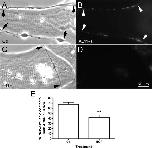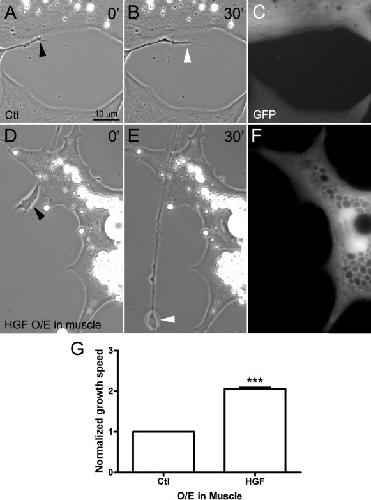 Figure 6. Increase in axonal growth by HGF overexpression in muscle. Axons grew slowly along GFP-positive muscle cells after contacting them (A), as shown by these two sequential images taken 30 min apart. Compared to GFP muscle cells, HGF-expressing muscle cells allowed unabated axonal growth after contact (D). Green fluorescence indicates GFP or HGF/GFP expression, and the arrows indicate the initial (0′, black) and final positions (30′, white) of the distal ends of the axons. G: The average growth speed of axons in contact with HGF-expressing muscle cells was calculated and normalized relative to the growth speed of axons touching control GFP-muscle cells. Mean SEM shown; t-test, ***P < 0.001 compared to control.