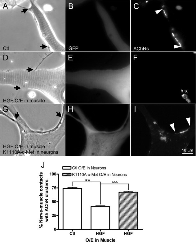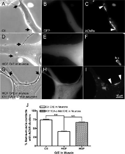 Figure 7. Suppression of NMJ formation by HGF overexpression in muscle. Cocultures were prepared using normal (A) or K1110A-c-Met-expressing (G) neurons and muscle cells expressing GFP (A) or GFP plus HGF (D). R-BTX-labeling showed that neurons induced less AChR aggregation in HGF-overexpressing muscle cells (F) than in control muscle cells (C). J: Expression of excess HGF in muscle cells resulted in ∼40% reduction in nerve-induced AChR clustering. However, compared with Ctl neurons (D), K1110A-c-Met-expressing neurons (G) were able to induce more AChR clusters (I) at nerve-muscle contact sites on HGF-expressing muscle cells; mean SEM; t-test, **P < 0.01. < 0.001. Arrows mark nerve tracks and the arrowheads show AChR clustering along innervation sites; .s.indicates an AChR hot spot in a cell expressing exogenous HGF in which nerve failed to induce AChR aggregation.