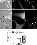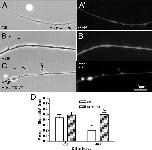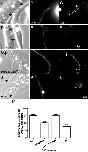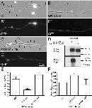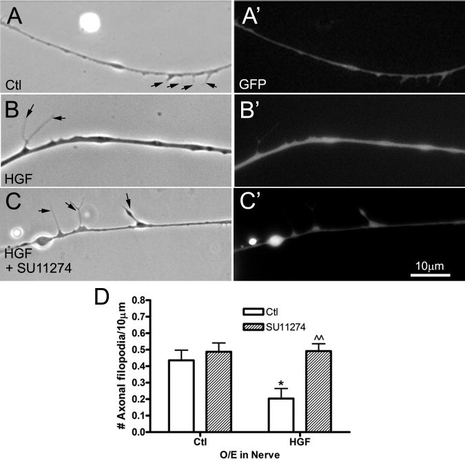 Figure 2. Inhibition of filopodial assembly in neurons by HGF. Phase-contrast (A) and fluorescence images (A′′) of cultured Xenopus spinal neurons expressing GFP (A′) or GFP and HGF (B′, C′). Filopodia along the axon are indicated by arrows in A. Compared to GFP-neurons (A, A′), neurons overexpressing HGF (B, B′) had fewer filopodia. However, bath application of 100 nM SU11274, a specific inhibitor of c-Met, rescued filopodial formation in HGF-expressing neurons (C, C′) almost to the control level. D: Filopodial densities calculated for axon segments from GFP- and HGF-neurons treated without or with SU11274; mean SEM, t-test, *P < 0.05.