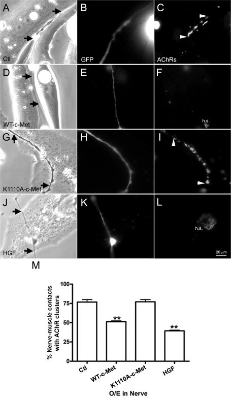 Figure 5. Inhibition of NMJ assembly by c-Met or HGF overexpression in neurons. Neurons expressing GFP (A) or GFP plus WT-c-Met (D), K1110A-c-Met (G), or HGF (J) were cultured with normal muscle cells. After 1 day, the cocultures were labeled with R-BTX to examine muscle AChR clustering. WT-c-Met-neurons (F) and HGF-neurons (L) poorly induced AChR clustering at innervation sites in muscle compared to GFP-neurons (C) and K1110A-c-Met (I). Pooled data from multiple cocultures were used to calculate percentages of nerve-muscle contacts with AChR clusters (M); mean SEM shown; t-test, **P < 0.01 compared to control. Arrows point to nerve tracks and arrowheads to nerve-induced AChR clusters; .s.marks pre-existing AChR clusters (hot spots) in muscle cells innervated by neurons expressing WT-c-Met (F) and HGF (L).