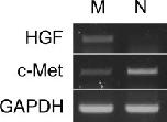 Figure 1. Expression of HGF and c-Met mRNAs in Xenopus nerve and muscle. Fragments of HGF and c-Met mRNAs were amplified by RT-PCR and separated using agarose gels. More HGF mRNA was detected in Xenopus myotomal tissue (M) than in neural tubes (N), while the opposite was the case for c-Met mRNA. GAPDH was used as a control for PCR amplification and gel-loading.