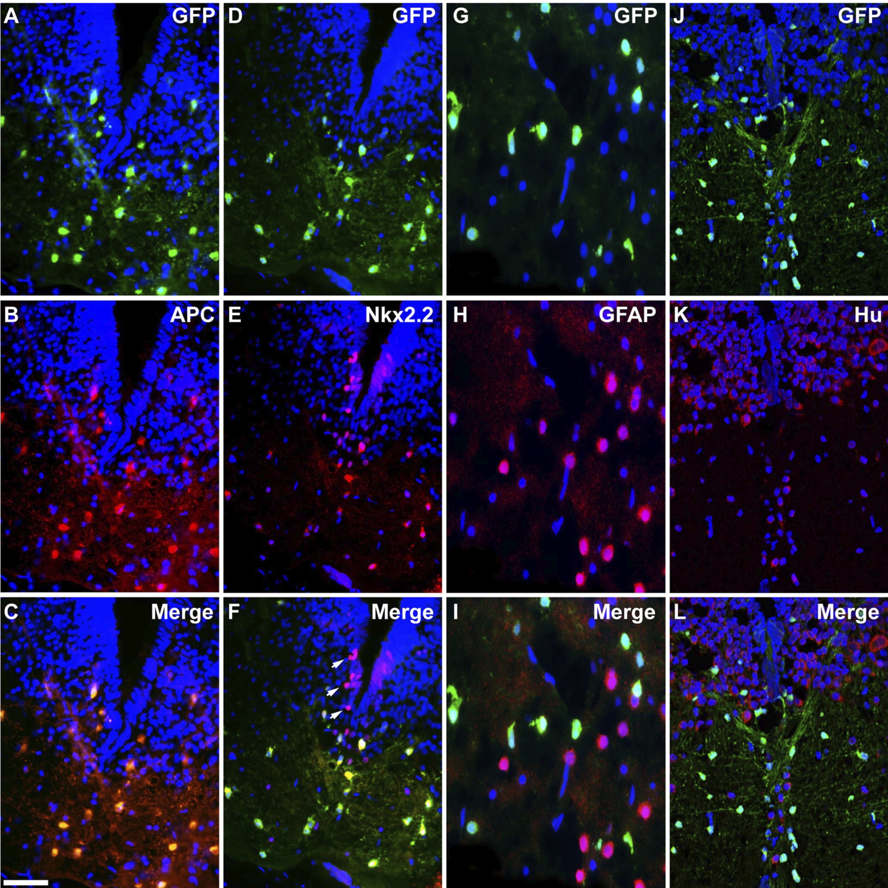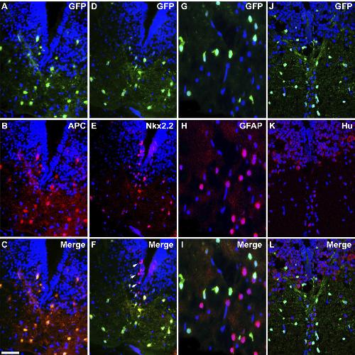 Figure 2. The pMBP-eGFP-NTR transgene drives expression in mature oligodendrocytes. Coronal tissue sections across the medulla of pMBP-eGFP-NTRtadpole at stage 55 co-immunostained for GFP and successive markers of different cells types. AâC, GFP and APC, a specific marker of mature oligodendrocytes. Note the complete overlap of GFP labeling with that of APC. DâF, GFP and Nkx2.2, a marker of progenitor of oligodendrocytes and mature oligodendrocytes. Note that cells doubly labeled for GFP and Nkx2.2 are localized in the white matter tract, with no GFP detection in Nkx2.2 ô° progenitors in the ventralventricular layer (white arrows in F ). GâI, GFP and GFAP, a marker of astrocytes. JâL, GFP and Hu, a pan-neuronal marker. Note the complete exclusion of GFP labeling with either GFAP (I ) or Hu (L). Scale bar (in C) AâF, JâL, 50 um; GâI, 25 um.